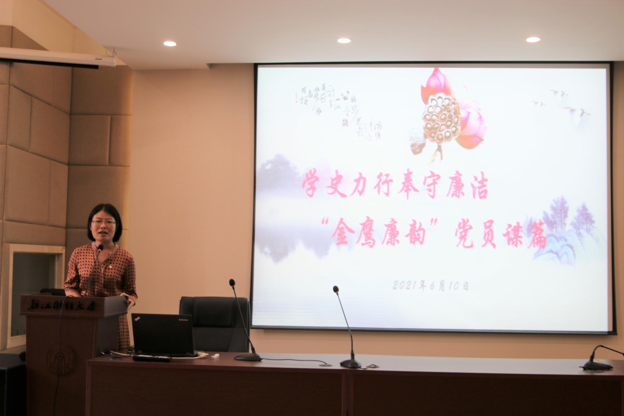 谢敏在仪式上宣读参加宣誓的新党员名单,并以《学史力行奉守廉洁 “金鹰廉韵”党员谋篇》为题给大家上廉洁教育党课。她强调,“大学生党员是党的未来,其清正守廉关乎党内的纯洁性,对保持党的生机有着重要的意义。”她结合足球直播线上看