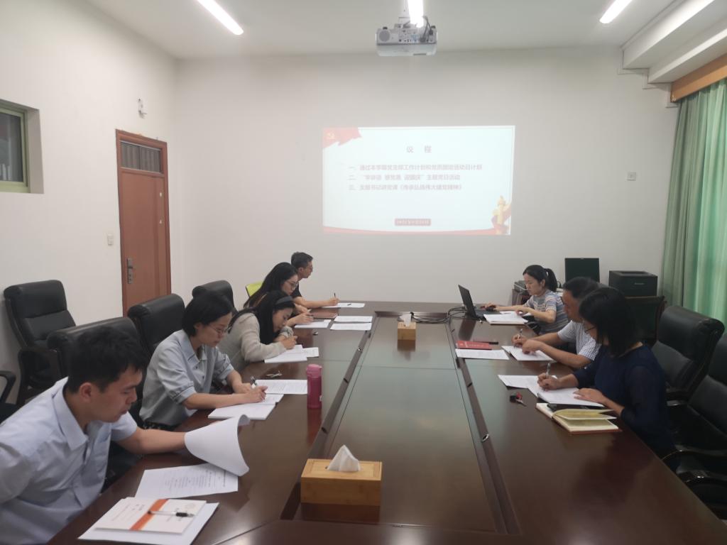 楼418会议室召开期初党支部大会,对本学期党支部工作计划和党员固定活动日计划作出部署,支部书记翟丽媛以《传承弘扬伟大建党精神》为题讲述了一堂微党课。