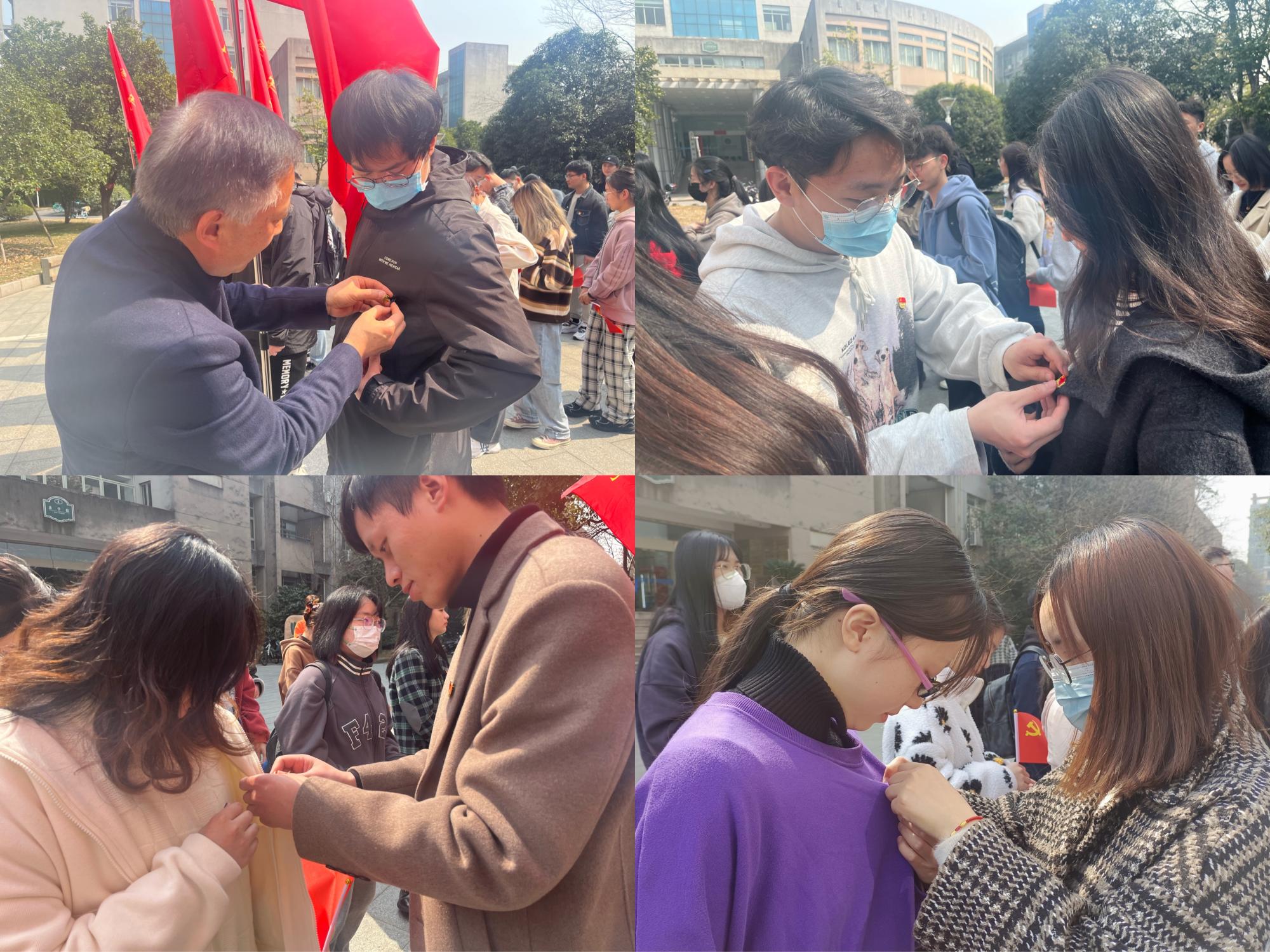 随后,与会老党员为新发展党员佩戴党徽。在蔡书记的带领下,全体新发展党员举起右拳,面向党旗,用慷慨激昂的语气庄严宣誓,表达对党的忠诚和为共产主义事业奋斗终生的决心。