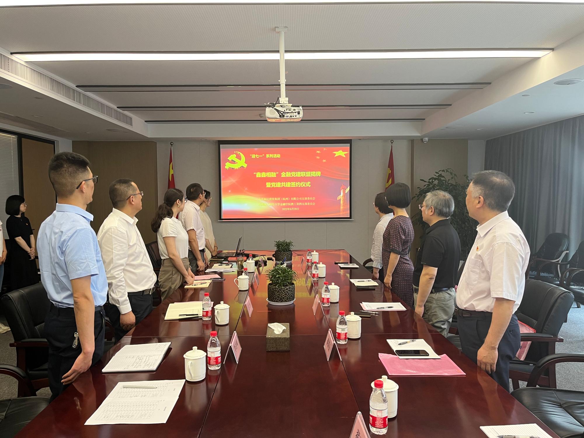 党委书记蔡国金,党委副书记谢敏,教工第四党支部书记、投资系主任徐峰,组织员翟丽媛,杭州钱塘新区产业发展集团有限公司党群工作部副部长汪文传,和达投资集团党支部书记、董事长、总经理张寒晓,党支部委员、副总经理李岳峰,党支部委员、副总经理周东锋及党员代表出席此次仪式。