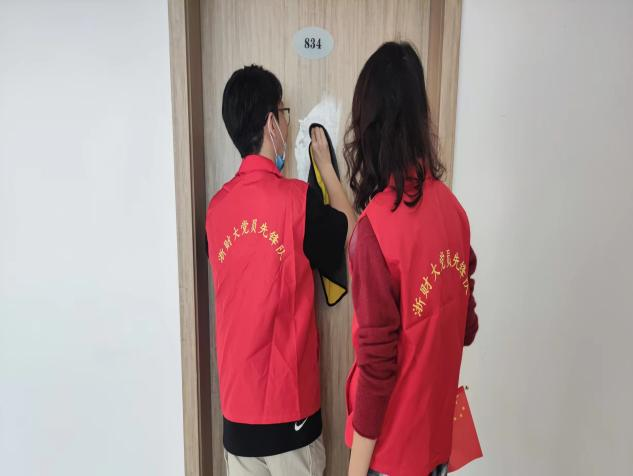 师生党员志愿者集合领取相关清扫用品并有序前往园区6楼和8楼开展清洁寝室木门工作。师生党员们不怕苦、不怕累,精神抖擞、细致耐心的擦拭木门并清理杂物,整个志愿服务过程分工明确、井然有序,为更舒适卫生的园区环境建设贡献了自己的力量。