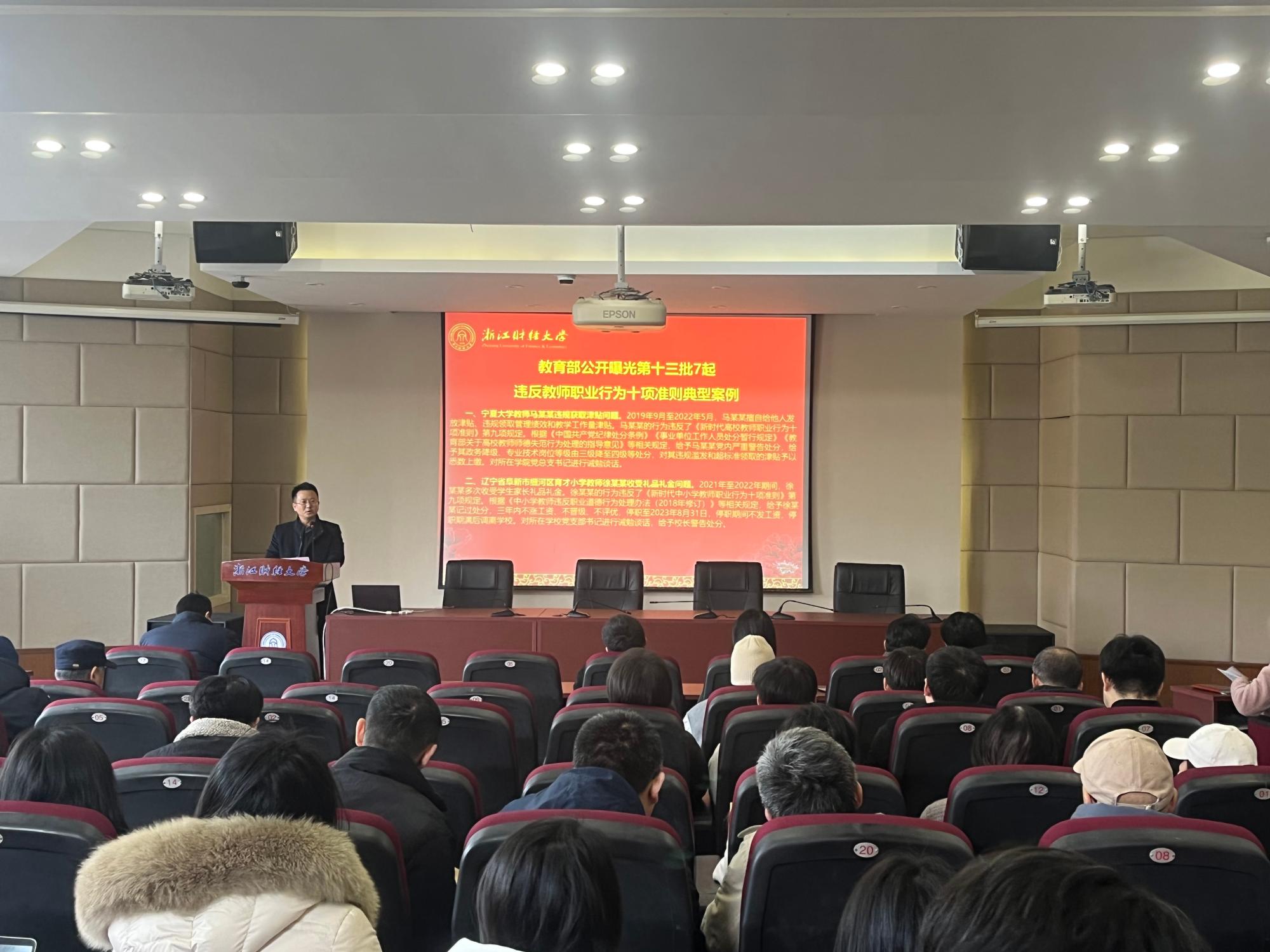 会上,黄文礼传达了《浙江财经大学师德失范案例通报与警示教育工作规程》文件要求,通报了《教育部公开曝光第十三批违反教师职业行为十项准则典型案例》,进一步带领全体教师学习《新时代高校教师职业行为十项准则》文件精神,警示老师们要以案为鉴、以案促改,严守师德底线,绝不触碰“红线”。