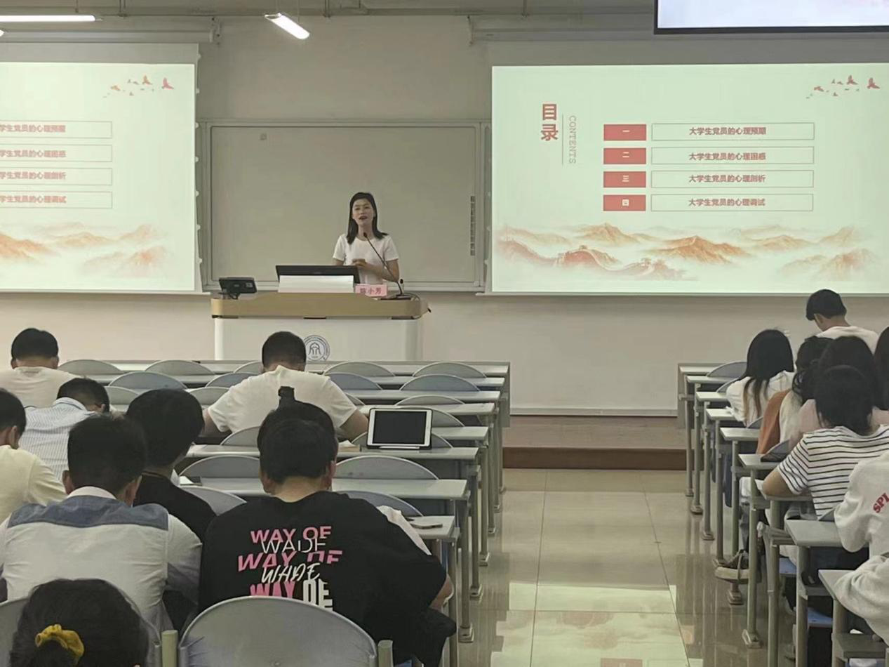 陈小芳《大学生党员的心理调适》为主题,她首先向同学们介绍了一些大学生党员可能存在的心理困惑,然后从社会环境、教育培养、个人局限性三个方面对大学生党员的心理进行剖析,最后提出要用政策制度、新媒体等加强对大学生党员的心理引导;高校要重视与开设相关课程以增强大学生党员心理素质;大学生党员本身提升抗挫折能力与培养积极的心态。希望在各方共同努力下,大学生党员的心理素质可以巩固与加强,以更好地应对挫折。