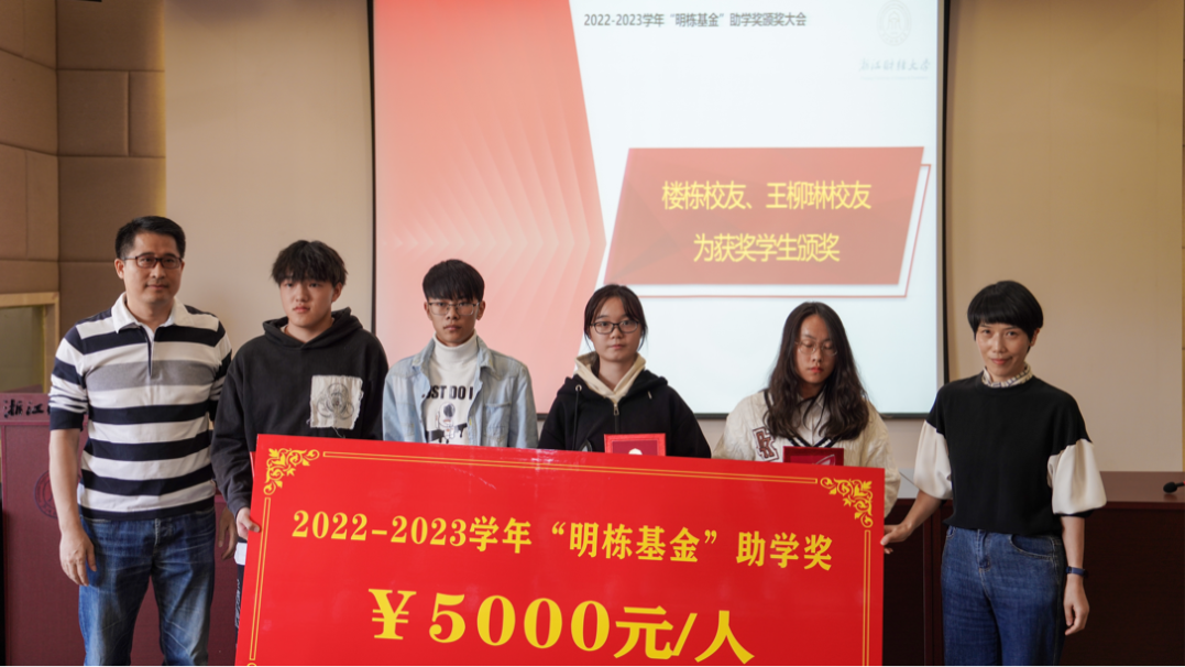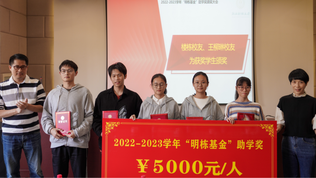 “明栋基金”管理委员会秘书长王丽荣向大家介绍了此次“明栋基金”助学奖的评审流程,校党委学工部副部长汪风易宣读2022-2023学年“明栋基金”助学奖获奖名单。楼栋和王柳琳校友为获奖学生颁奖。