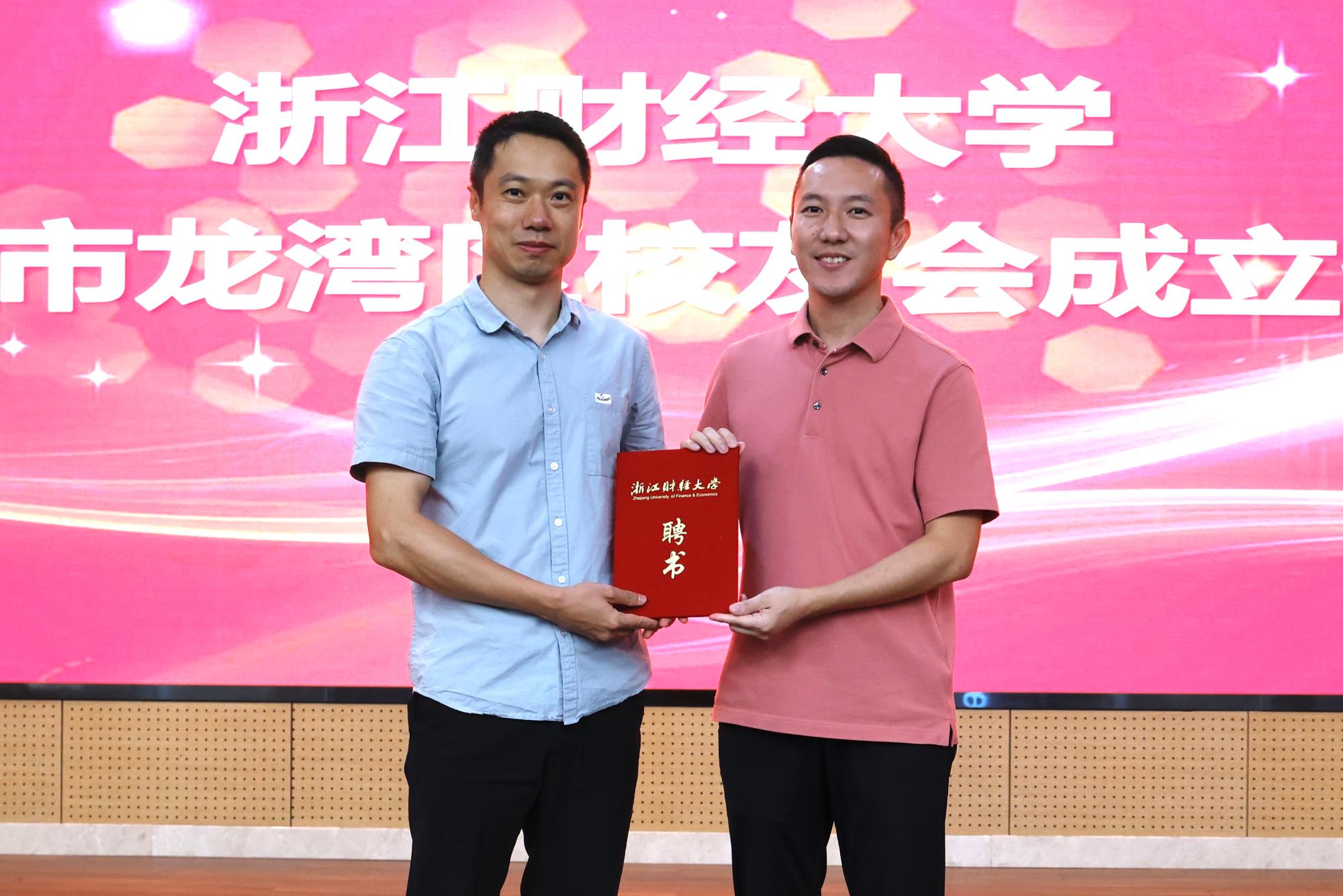 随后,孙莹宣读了理事会名单。蔡叶波当选为会长,施寒毅、黄茫茫、王素珍、王光昌、张瑜瑜(兼任秘书长)、夏维国(兼任常务副秘书长)当选为副会长,蔡小跃当选为常务副秘书长,黄君畅、戈晓菲当选为副秘书长。黄建新向会长、副会长颁发了聘书。温州校友会副会长戴中坚向秘书长、副秘书长颁发了聘书。蔡国金向龙湾区校友会授旗。