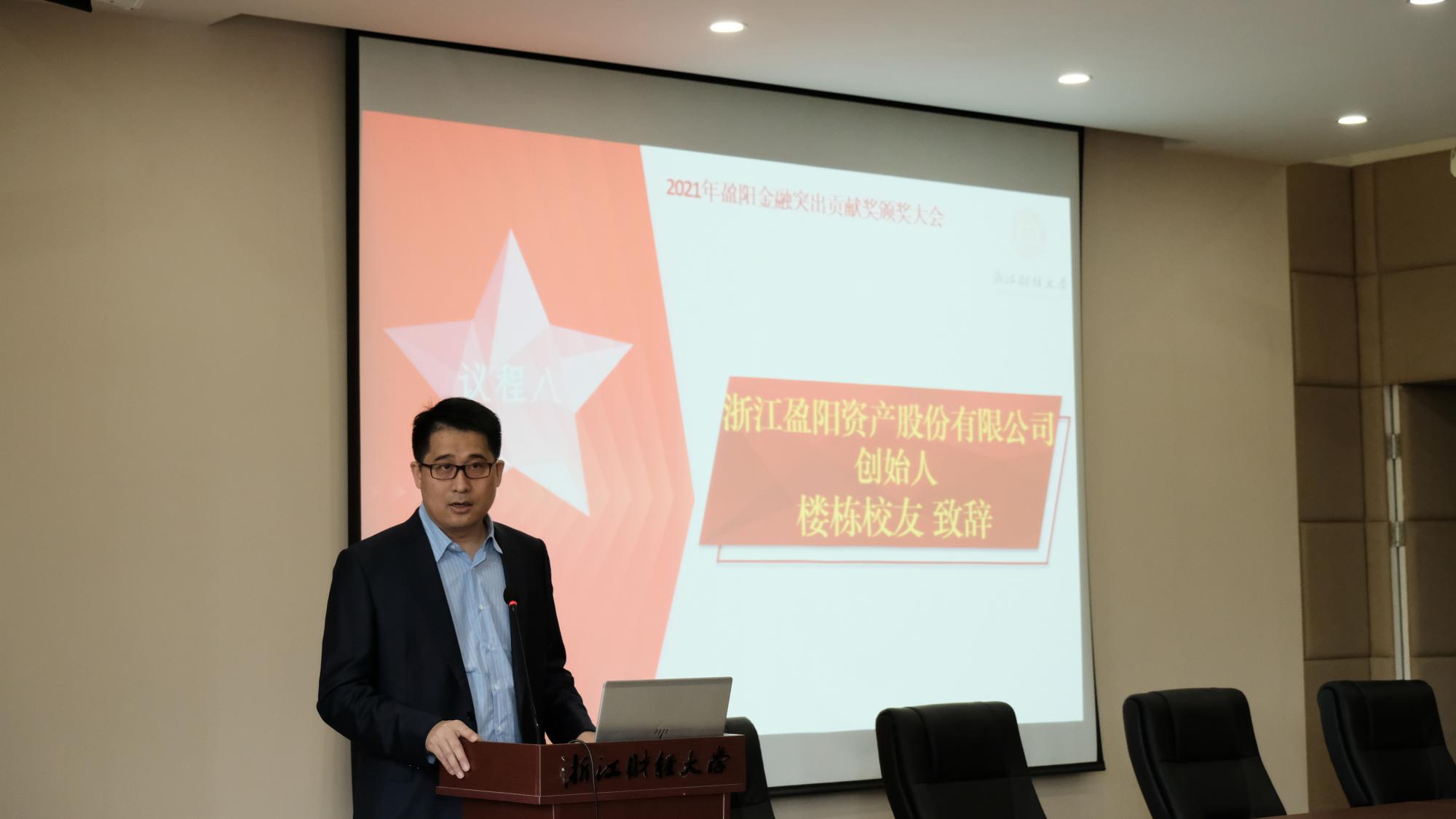 接着,浙江盈阳资产管理股份有限公司创始人楼栋校友讲话。他总结了设立“盈阳金融突出贡献奖”的初心和使命,赞扬了广大教师在教书育人、科研以及社会工作方面的突出贡献,着重肯定了获奖教师对提升足球直播线上看