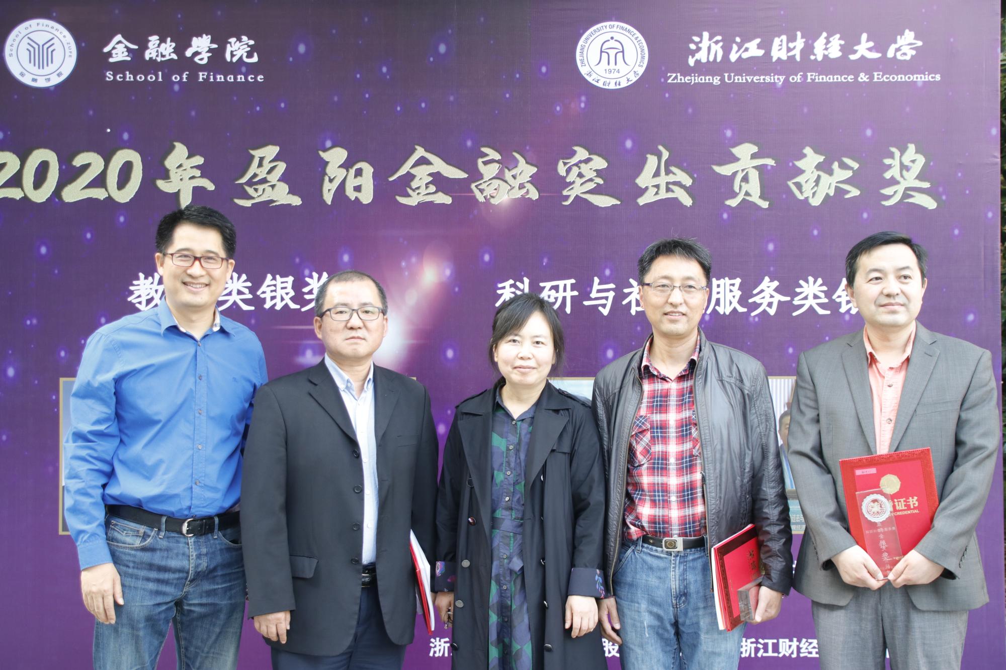 经评审,朴哲范老师、阎晓春老师分别获得2020年盈阳金融突出贡献奖教学类银奖;钟立新老师、耿中元老师分别获得科研与社会服务类银奖。孙旭东书记、楼栋校友为获奖老师颁发了获奖证书及奖杯。