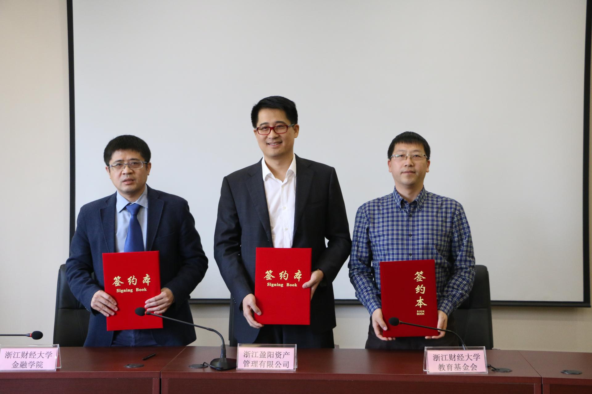 首先进行的是浙江盈阳资产管理股份有限公司第二期合作项目捐赠签约仪式。今年9月,盈阳资产管理股份有限公司与学校签订了校企合作框架协议,捐赠300万元用于合作项目建设。楼栋校友、陈荣达院长、杨健勇副处长共同签署了第二期合作项目捐赠协议书,各位领导、校友嘉宾及在场的师生们共同见证了这一神圣的时刻。
