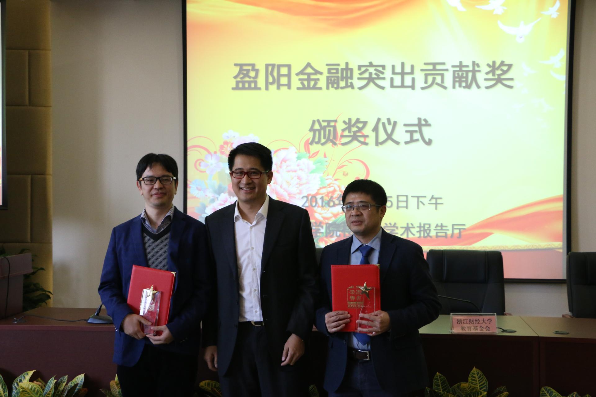 随后举行了盈阳金融突出贡献奖颁奖仪式,陈荣达教授与胡旭阳教授获得盈阳金融突出贡献奖金奖。浙江盈阳资产管理股份有限公司创始人楼栋先生为他们颁奖,并合影留念。最后,胡旭阳教授上台发言,他通过形象生动的语言,结合自己的亲身经历,介绍了线上看足球