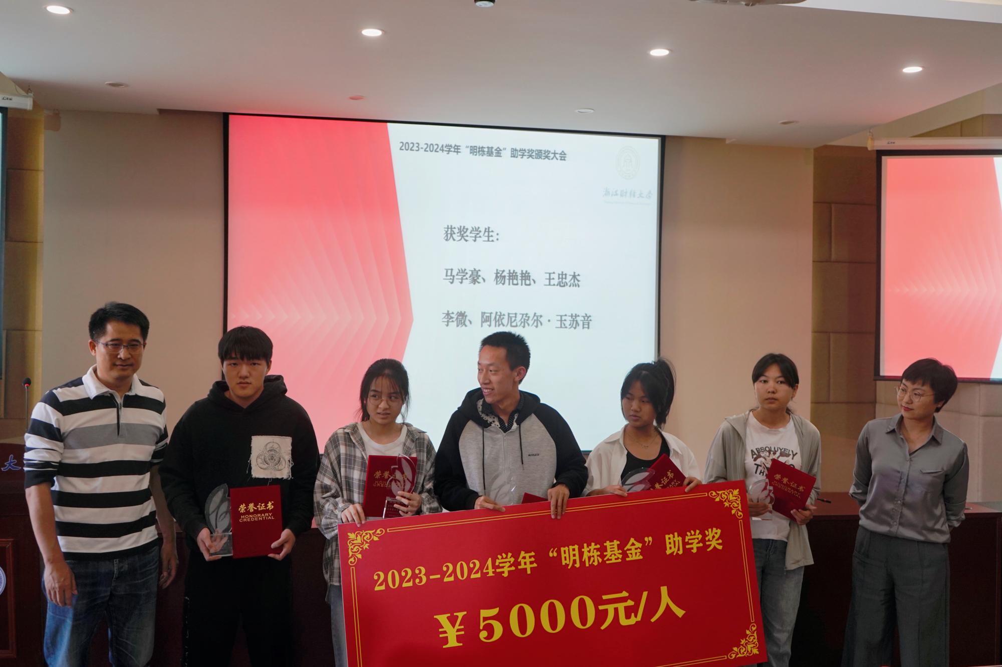 家境经济困难的学生勤奋学习、努力进取,在德、智、体、美、劳等方面取得更加全面的发展。本次共有本次共有马学豪、杨艳艳、李微、阿依尼尕尔·玉苏音、王忠杰、卢美、王品、楼一凡、徐佳慧、黄小丹、陈钺、文秋云、冉怡婷、巫佳莉、袁静、李孟丹等16名同学获得“明栋基金”助学奖,“明栋基金”管理委员会主任楼栋和秘书长王丽荣为获奖同学颁发证书及奖杯。