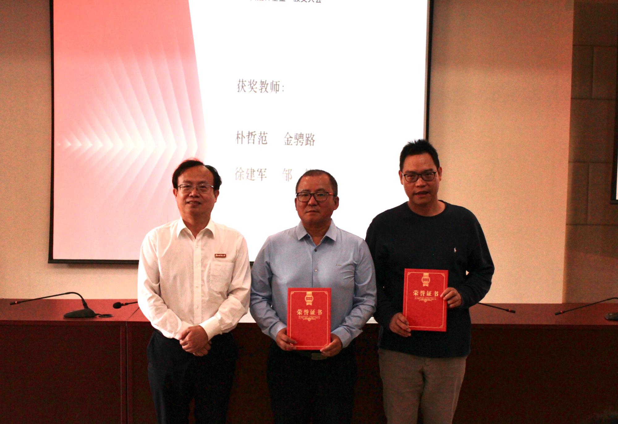 朴哲范、金骋路老师获评“盈阳金融突出贡献奖”育人类金奖。楼栋校友为获奖教师颁发奖杯及证书。
