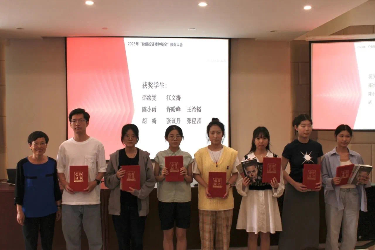 朴哲范、徐建军、邹静、金骋路四位老师获2022年“价值投资播种基金”之“匠人园丁教学科研鼓励奖”;朱卉、胡旭阳、刘建和、柏杨、徐峰、闵峰六位老师分别获2022年“价值投资播种基金”之“基础性课程建设奖”的一、二、三等奖;徐峰、胡旭阳、刘建和老师团队获投资类课程建设“阶段性课程建设奖”二等奖;徐远扬、刘硕两位同学主持的课题获2022-2023学年“价值投资播种基金”之“价值投资研究专项课题”立项;邵绘雯等8位同学获2022-2023学年“价值投资播种基金”之“星辰大海投资类课程奖”。黄建新、王聪聪、蔡国金、夏红芳、徐敏依次为立项及获奖的老师们、同学们颁奖。