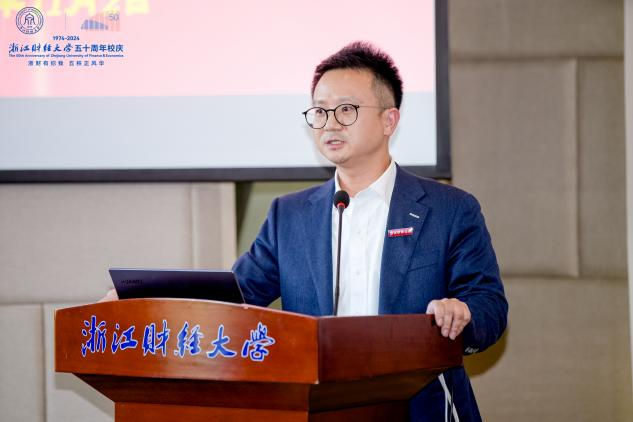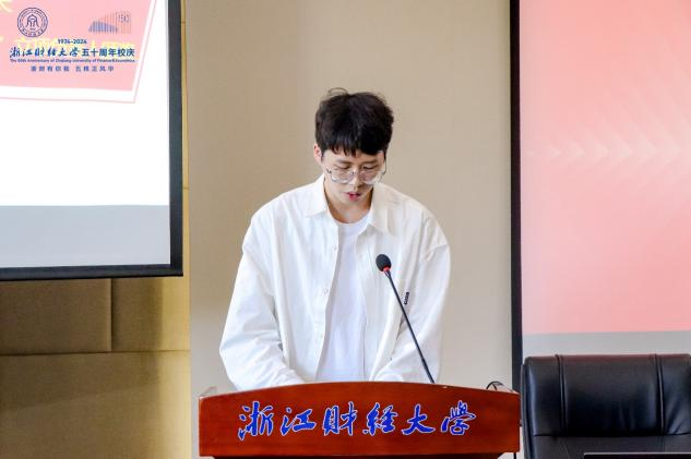 2003届校友徐冠华深情表达对浙财大的爱,强调校友与学校的情感共同体,鼓励大家为国家发展贡献青春力量。金融学子和校友们深受鼓舞,应援声接连不断。