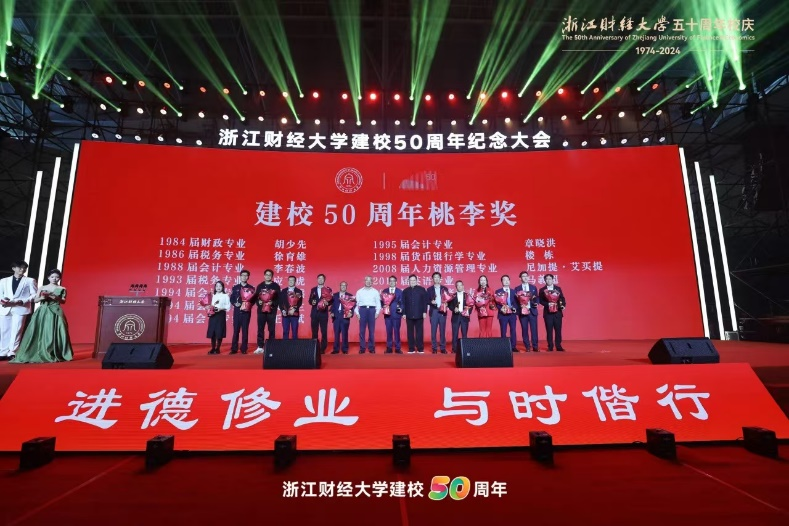 上午10点,浙江财经大学50周年纪念大会在西体育馆隆重举行。五十载光阴流转,浙江财经大学栉风沐雨、历尽沧桑而不懈奋斗,培育了莘莘学子,他们在各行各业中熠熠生辉,和学校一起以坚定的步伐和昂扬的姿态迈向未来,拥抱世界。