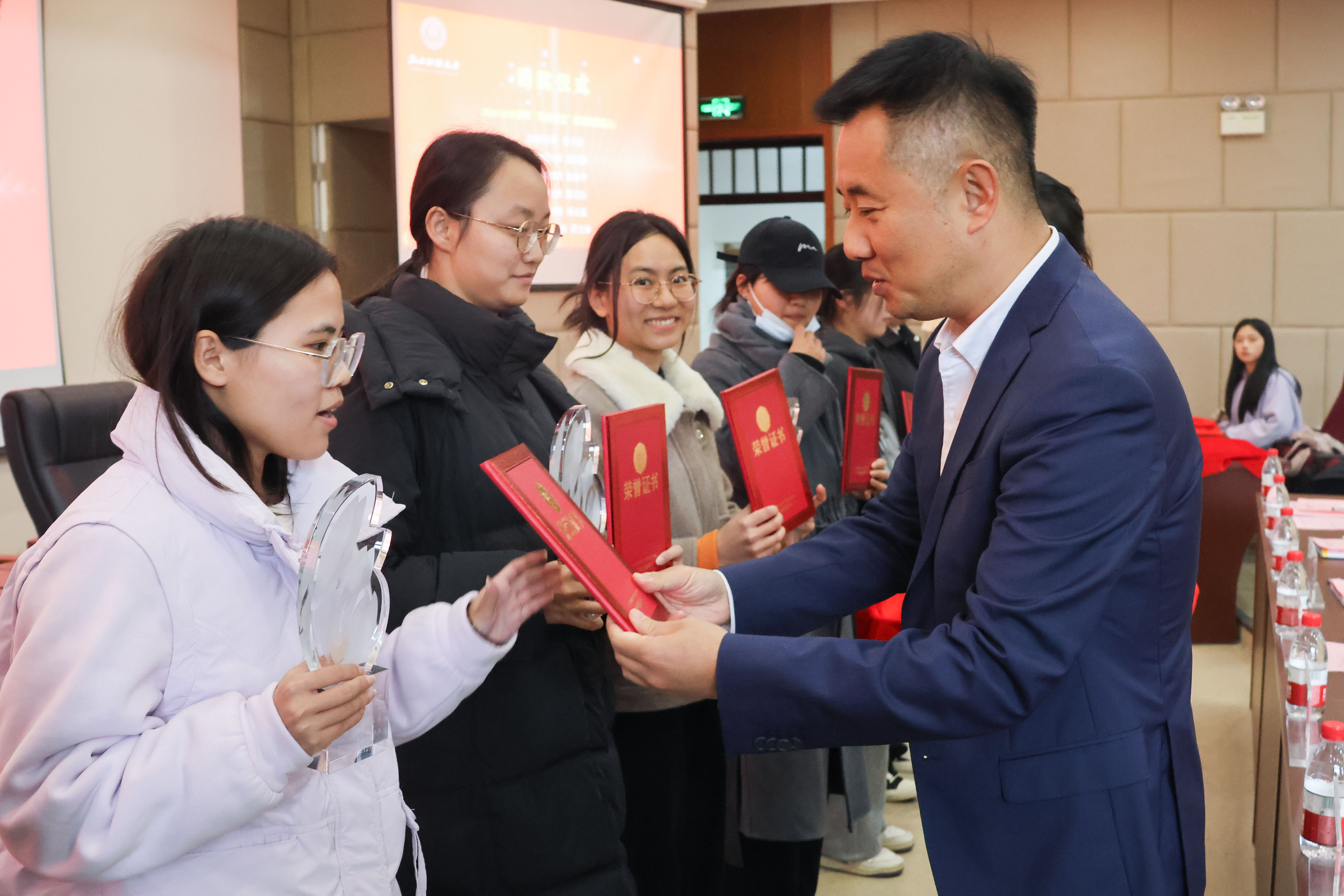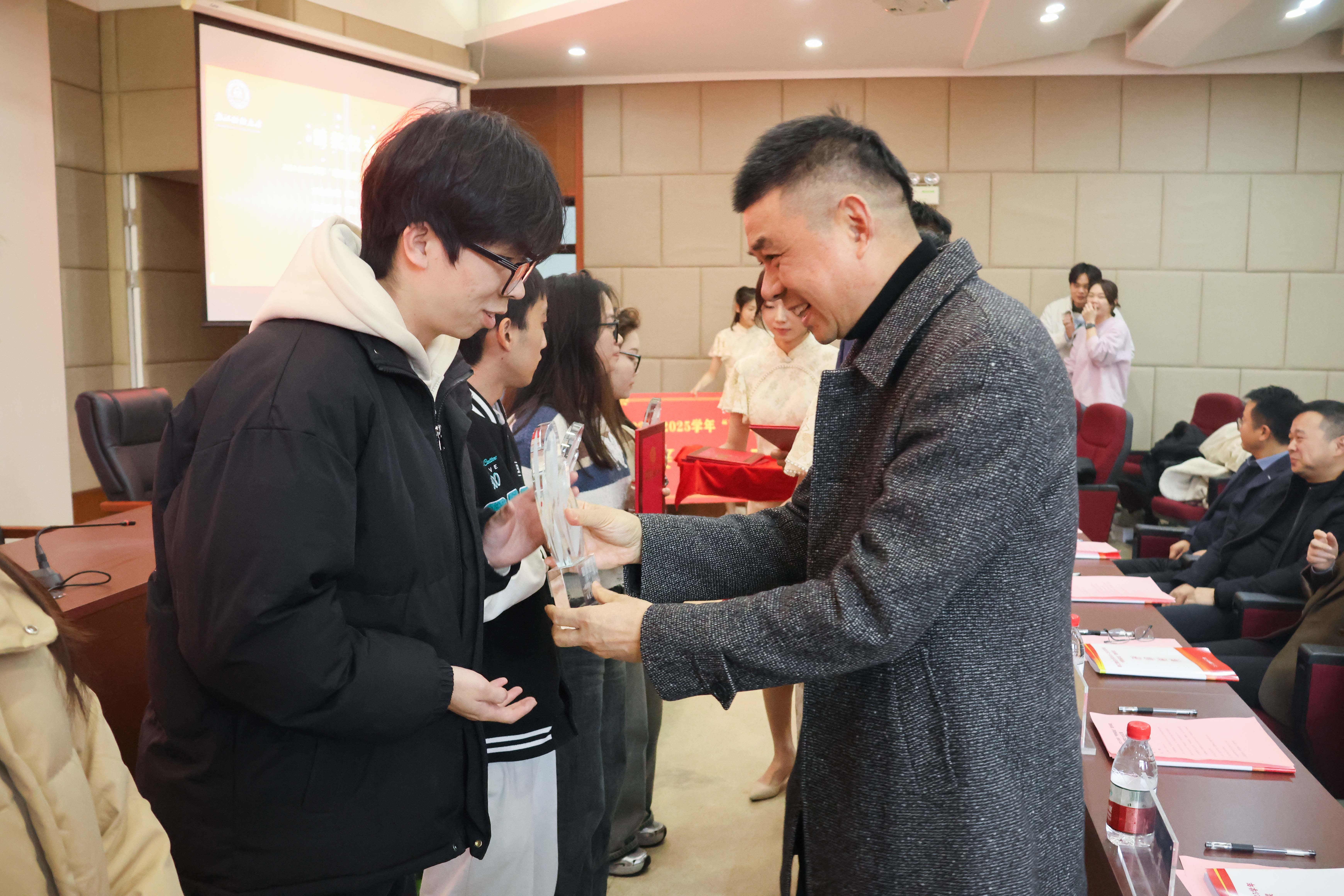 校党委副书记程爽,“明栋基金”捐赠人、蓝山投资有限公司董事长王晓明为获奖学生颁奖。