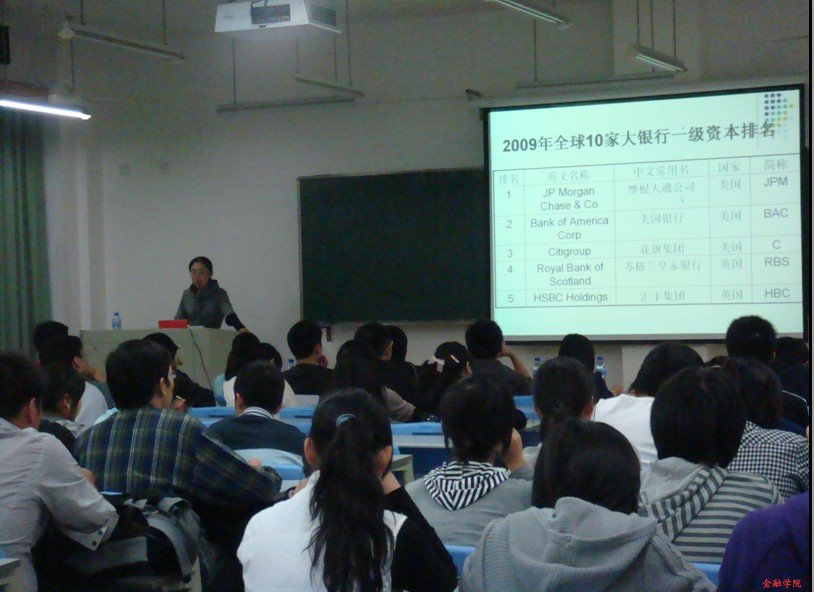 面对热情的同学们,鲁莹老师面带微笑,有条不紊地为大家讲解一些国际银行业的知识。首先向同学们介绍了去年英国《银行家》杂志评选出的全球十大银行,接着就各个银行分别展开介绍,其中重点讲述了有关花旗银行和高盛的历史及经营状况。花旗银行曲折的发展经历让同学会明白投资银行学问的博大精深。而备受争议的高盛成功避免美次贷危机这场灾难,这个能打赢石油战争这样大规模金融战役,制定出“金砖四国”、“新钻11国”经济预言进而主导世界金融发展的国际大投行,让同学们惊异于银行金融叱咤风云的魅力。