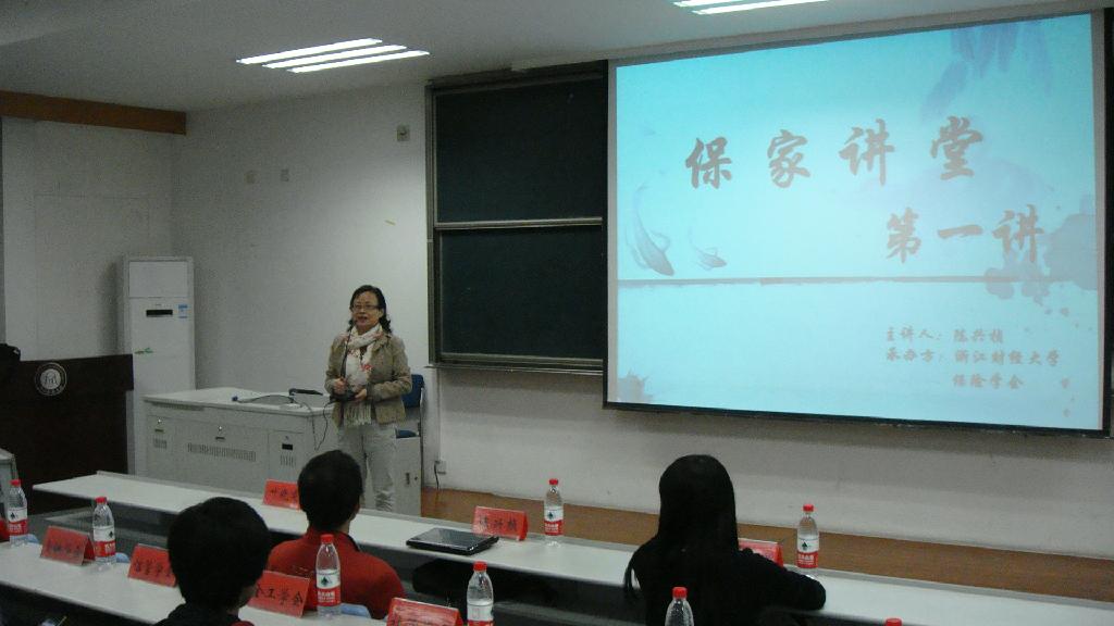 讲座一开始,由叶晓凌老师代表讲话,并对陈兴桢经理进行了介绍。随后,陈兴侦经理从六个方面讲述了他的经验体会。首先,陈经理就明确提出保险是对安全的保障。人生的规划存在潜在风险,而保险公司能够出面承担这类风险,因此保险行业发展潜力巨大。但与此同时,机遇与挑战并存。陈经理又指出我国保险发展还处于初级阶段,与先进发达国家相比差距甚远,我国的保险行业的发展依旧任重道远。陈经理鼓励同学们认真学好专业知识,为保险业的发展贡献出自己的一份力量。在之后的自由提问环节中,同学们积极提问,陈经理也一一作出了详细的解答,现场气氛热闹非凡。