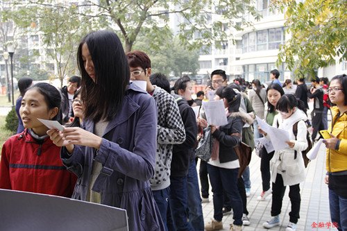 第二关“融智引知”的现场欢呼加油声此起彼伏。“百步穿杨”环节由选手投掷飞镖决定题号,然后由一位选手向另一位选手解释该题号所对应的金融名词,并由另一位选手猜测该名词。在飞镖投掷和形象趣味的名词描述中,选手们的笑声溢满了活动现场,原本陌生的同学不知不觉中打成一片,气氛轻松活跃。而接下来的“金融达人”环节则需要两位选手在规定时间内完成金融知识填空。这不仅仅考验了两位选手对金融知识的把握程度,更需要他们彼此间合理分工、互相协作。