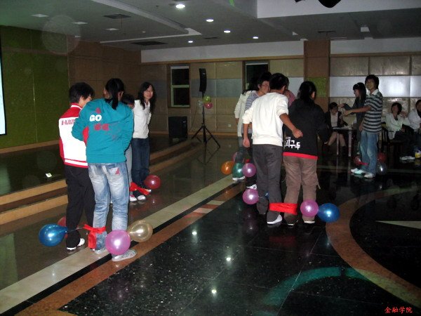 晚会上,同学们之间的互动相当热烈。夹排球,击鼓传花,瞎子捉人,猜词秀,踩气球……精彩的互动节目一个接一个,现场的气氛一浪高过一浪。08保险的黄琨和丰竟成表演的《双簧-金盆洗脚》,更是精彩,全场叫好声迭起。