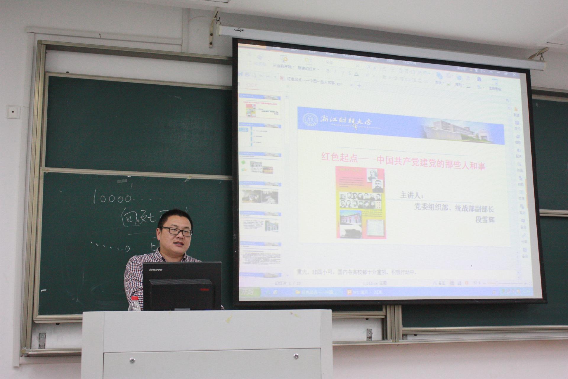 段雪辉老师以《红色起点——中国共产党建党的那些人和事》为主题进行授课。首先,他以一段讲述建党初期事迹的纪录片为开头,引出了中国共产党如何建党、建党之艰辛、建党之努力的故事。随后,老师为同学们讲述了在建党过程中涌现出的一系列英雄事迹与人物,并激励同学们向前辈们学习,踊跃进取。