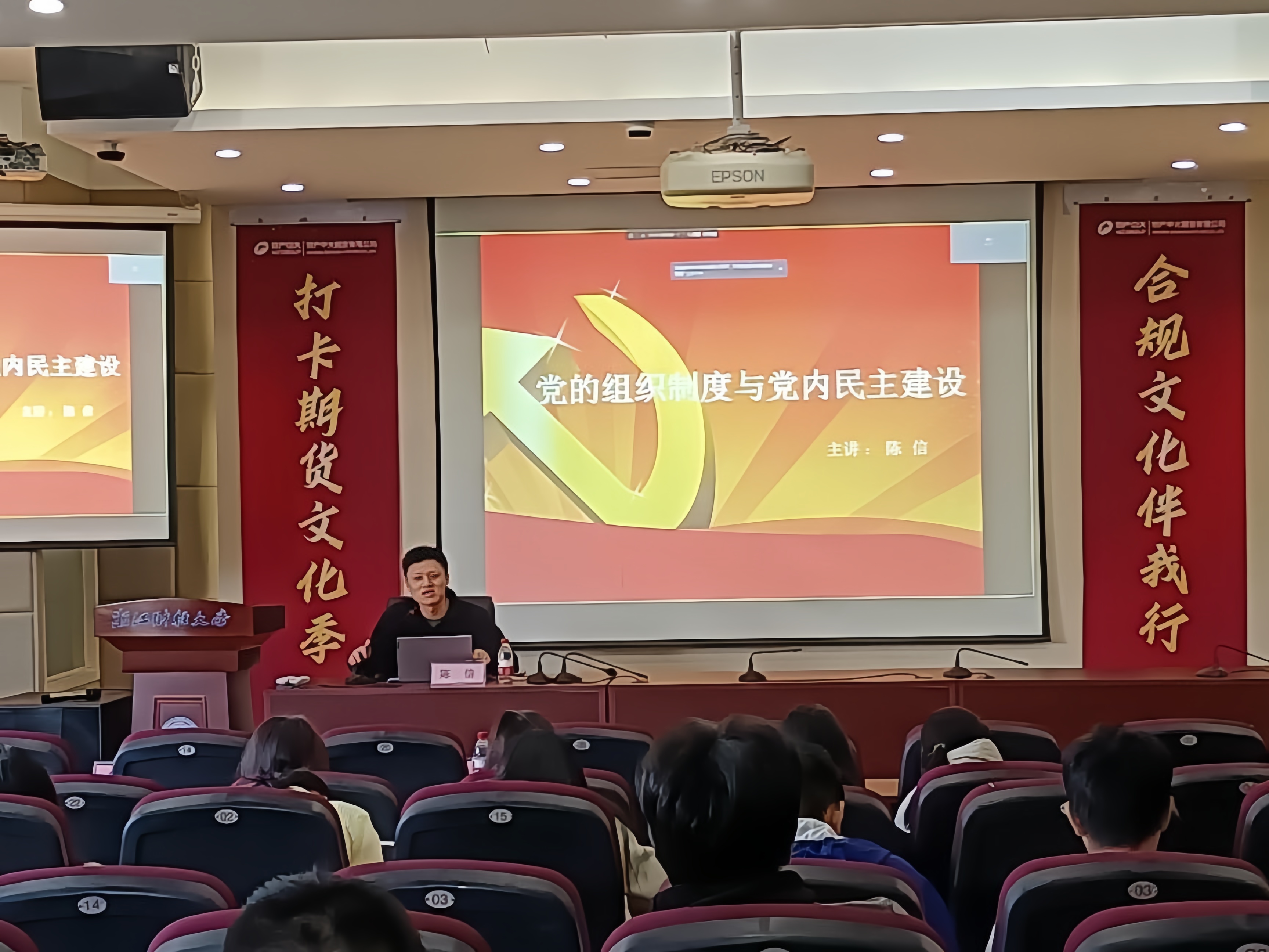 陈信以《党的组织制度与党内民主建设》为主题,全面且细致地讲述了民主集中制的内涵、发展过程和表现,介绍了党内民主建设的关键要点。使同学们深入领会了民主集中制的科学性、严肃性,明晰党内民主对党组织活力的重要意义,切实加强了对党的组织制度的认知。最后,陈老师鼓励大家将理论内化于心,外化于行,积极践行党内民主,为党组织建设添砖加瓦。