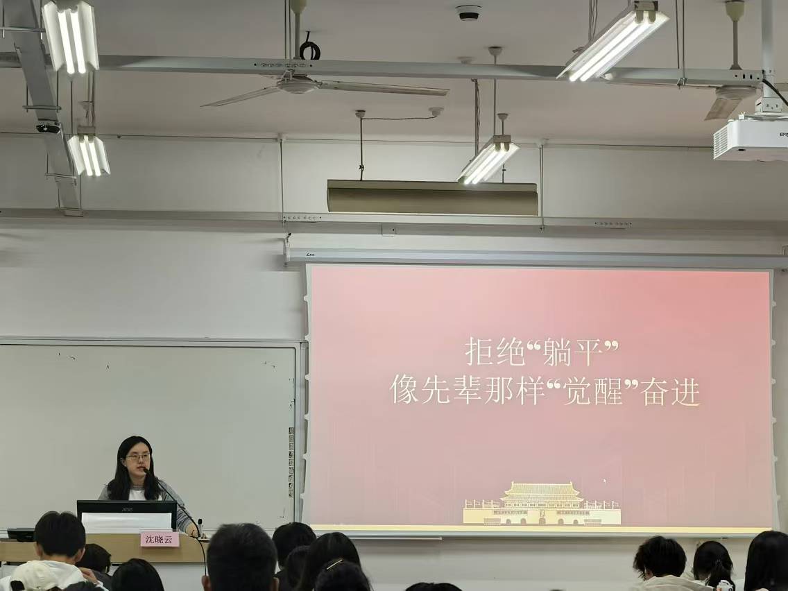 沈晓云老师以《拒绝“躺平”,像先辈那样“觉醒”奋进》为主题,带领同学们穿越回风云激荡的“觉醒年代”,看陈独秀、李大钊等先辈在暗夜中擎起思想火炬,以无畏之姿冲破旧秩序枷锁,唤醒沉睡国民;深度剖析当下 “躺平” 心态的成因,戳中现实痛点,让同学们从榜样中感受信仰方向、从历史中汲取精神力量,勇于走出生活舒适区,克服认识盲区,要勇毅力行,撸起袖子加油干,在争先创优中体现价值、实现理想。