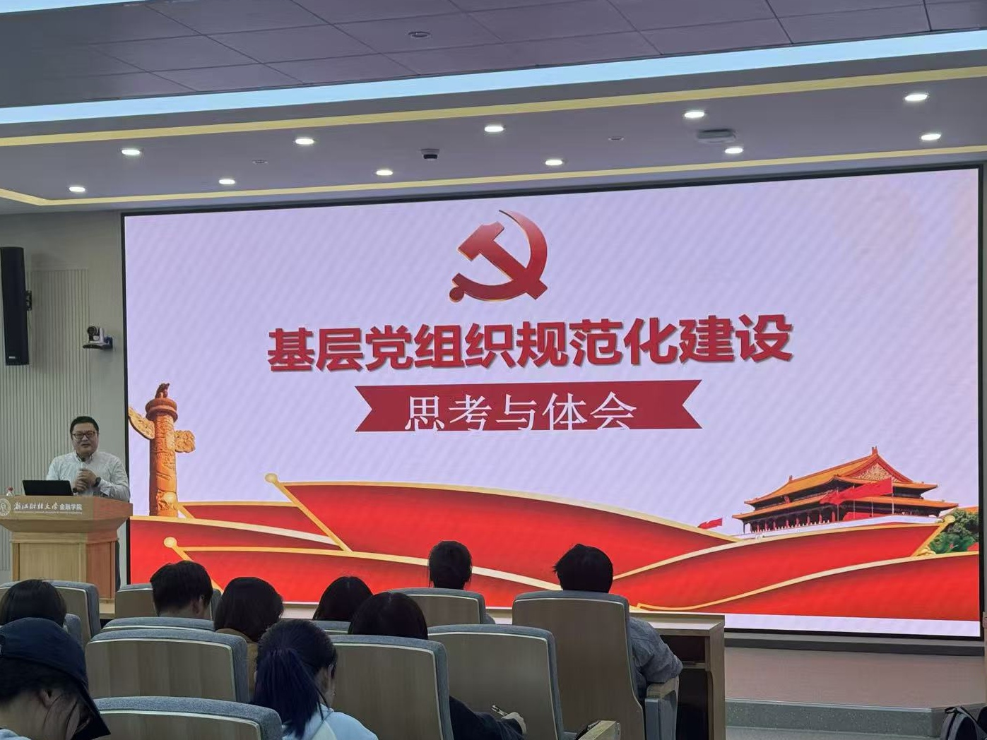 段雪辉以《基层党组织规范化建设思考与体会》为主题,结合《中国共产党普通高等学校基层组织工作条例》,详细解读了高校基层党组织设置原则、主要职责与发展党员工作的规范流程,强调了“三会一课”、组织生活会、民主评议党员等制度的关键作用。段老师还系统阐述了规范化建设的重要意义、现实问题与实践路径。