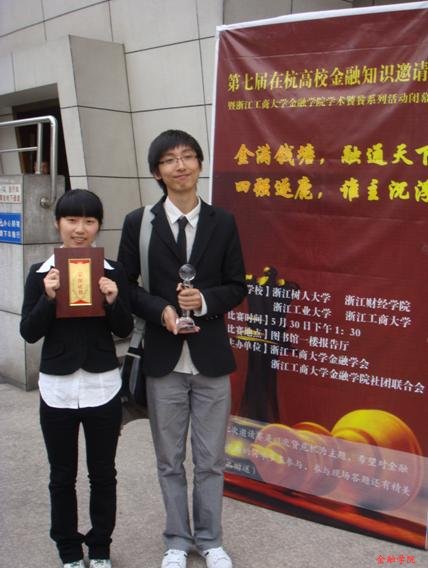 5月31日下午,在浙江工商大学的报告厅内举行了第七届在杭高校金融知识邀请赛。参赛选手们正统的职业套装充分显示了金融学子严谨的态度,而脸上带着的沉稳笑容又同时散发出从容不迫的气质。来自浙江工业大学、浙江工商大学、浙江树人大学以及我校的参赛队伍...