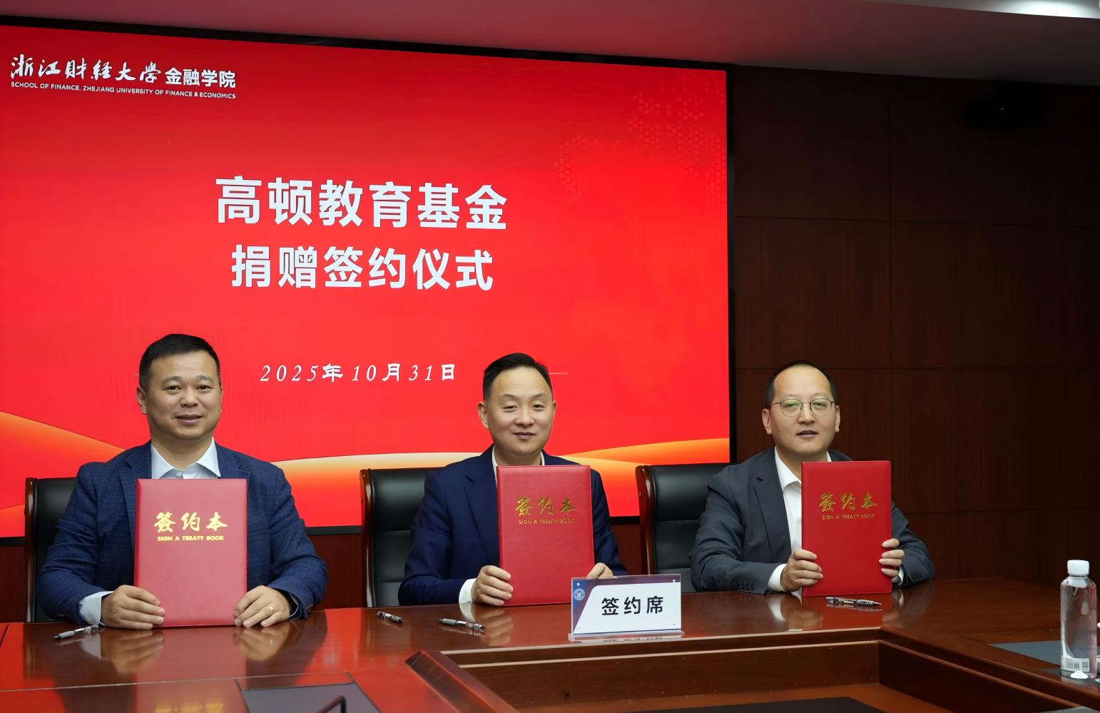 2025年10月31日,“高顿教育基金”捐赠签约仪式在浙江财经大学下沙校区行政楼412会议室举行。校党委副书记程爽、高顿集团副总裁兼校企事业部总经理舒畅、校企事业部华东区域总监郭太平等出席仪式。