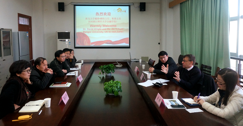 2014年12月17日,英国班戈大学教学质量评估主管戴维•赖特和教学资源与项目服务部主任靳旖访问足球直播线上看 ,他们在国际交流合作处处长余慕鸿的陪同下,与金融院长李连华、副院长夏红芳以及部分教师进行了座谈。