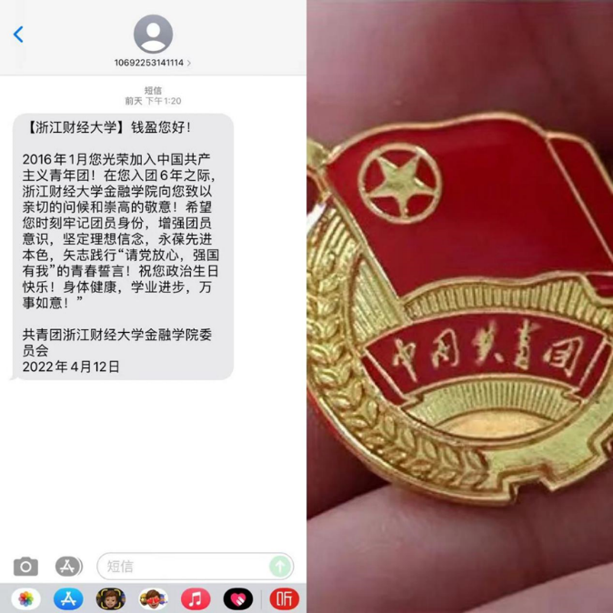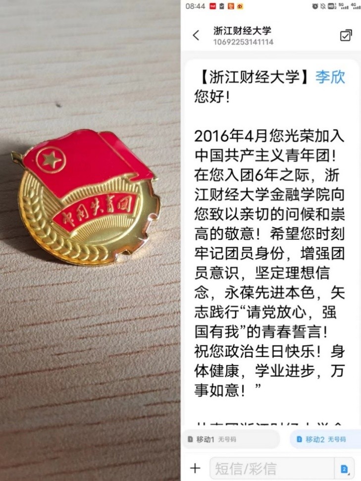 团委发送的“入团纪念日”短信。正值节日前夕,收到这条特别祝福短信,同学们深受鼓舞,也倍感温暖,纷纷晒出照片,表达着自己的热烈情感。