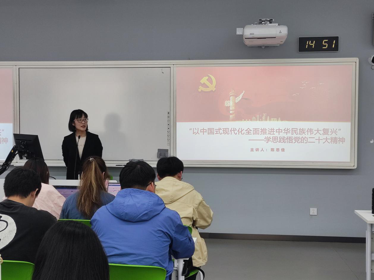 陈思佳围绕《以中国式现代化全面推进中华民族伟大复兴——学习党的二十大精神》的主题,向同学们介绍了中国过去五年取得的16个方面的成就,包含了最具标志性意义的6个方面,以及中国发生的3件大事。告诉我们要把学习贯彻二十大精神与学校全面推进特色鲜明的一流财经大学结合起来,为此,我们必须坚持和加强党的全面领导,坚持中国特色社会主义道路,坚持以人民为中心的发展思想,坚持深化改革开放,坚持发扬斗争精神。