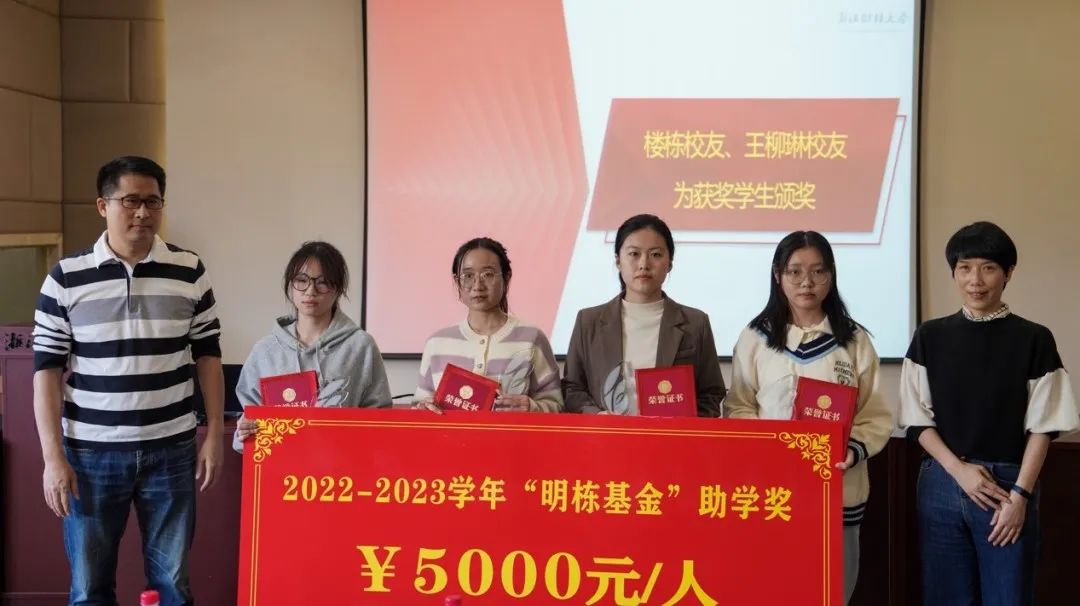 “明栋基金”管理委员会秘书长王丽荣向大家介绍了此次“明栋基金”助学奖的评审流程,校党委学工部副部长汪风易宣读2022-2023学年“明栋基金”助学奖获奖名单。楼栋和王柳琳校友为获奖学生颁奖。