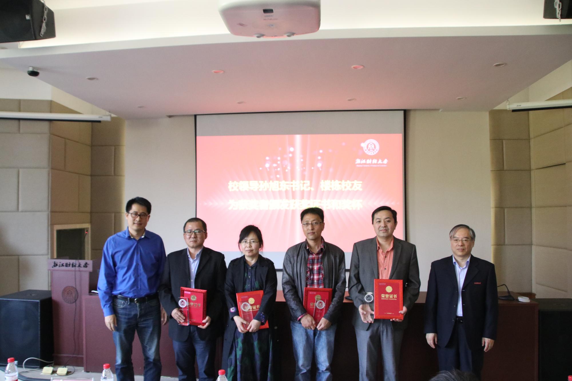 经评审,朴哲范老师、阎晓春老师分别获得2020年盈阳金融突出贡献奖教学类银奖;钟立新老师、耿中元老师分别获得科研与社会服务类银奖。孙旭东书记、楼栋校友为获奖老师颁发了获奖证书及奖杯。