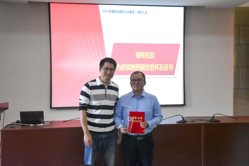 朴哲范、金骋路老师获评“盈阳金融突出贡献奖”育人类金奖。楼栋校友为获奖教师颁发奖杯及证书。