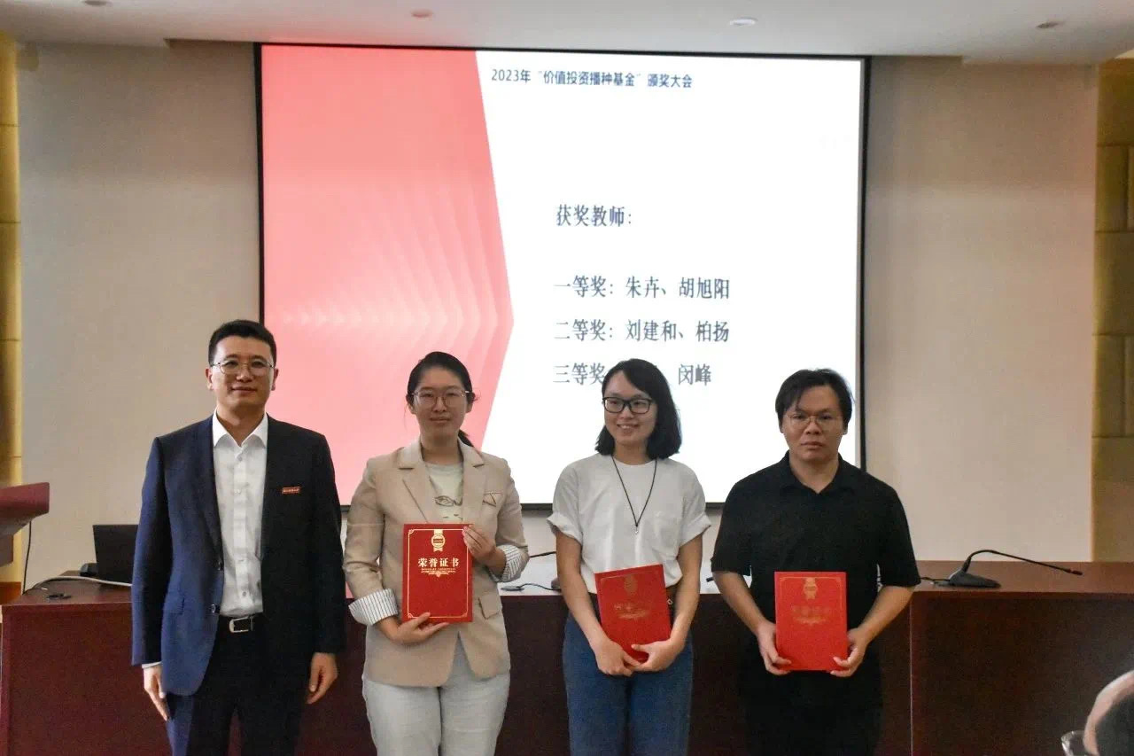 朴哲范、徐建军、邹静、金骋路四位老师获2022年“价值投资播种基金”之“匠人园丁教学科研鼓励奖”;朱卉、胡旭阳、刘建和、柏杨、徐峰、闵峰六位老师分别获2022年“价值投资播种基金”之“基础性课程建设奖”的一、二、三等奖;徐峰、胡旭阳、刘建和老师团队获投资类课程建设“阶段性课程建设奖”二等奖;徐远扬、刘硕两位同学主持的课题获2022-2023学年“价值投资播种基金”之“价值投资研究专项课题”立项;邵绘雯等8位同学获2022-2023学年“价值投资播种基金”之“星辰大海投资类课程奖”。黄建新、王聪聪、蔡国金、夏红芳、徐敏依次为立项及获奖的老师们、同学们颁奖。