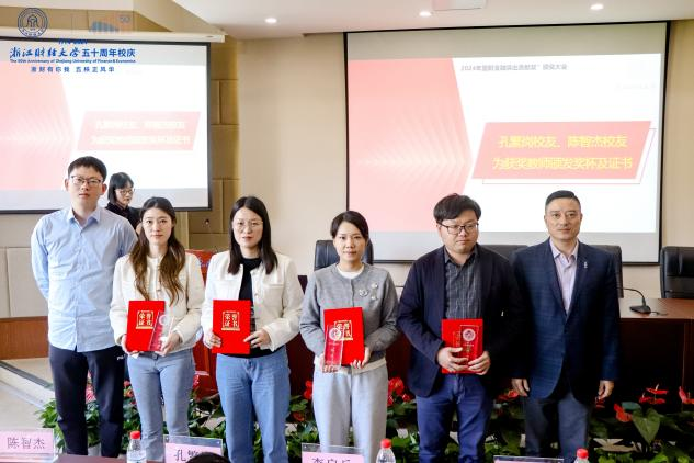 师资队伍建设,促进金融学科专业建设,为社会培养更多优秀金融人才。经评审,刘建和老师荣获本年度“盈阳金融突出贡献奖科研与服务类”金奖,龙怀钢、许跃龄、喻贞、邹静老师荣获“盈阳金融突出贡献奖科研与服务类”银奖。程爽、孔繁岗、陈智杰为获奖教师颁发奖杯及证书。