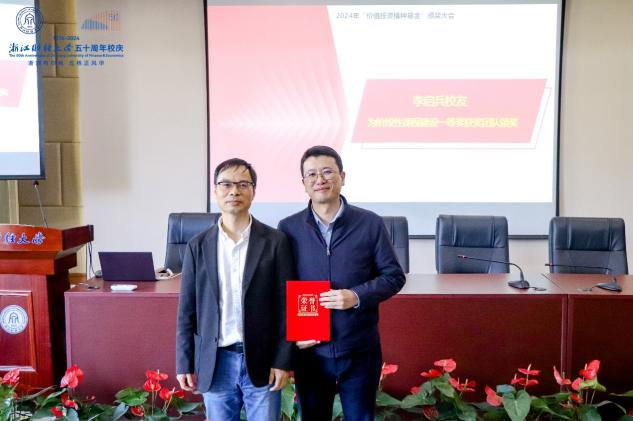 随后,李启兵校友介绍了“9621经典博学研习奖学金”的设立初衷,一是希望成为同学们践行校训“进德修业,与时偕行”的推动力。二是希望引导同学们走正确的“大道”。三是让同学们懂得反复诵读能够提高专注力去领悟。他希望通过这一奖学金能助力母校培育出一批投资领域的大师巨匠,为社会创造长期价值。该奖项旨在鼓励在校师生、校友及校友子女研读名著经典,培养未来价值投资大师。