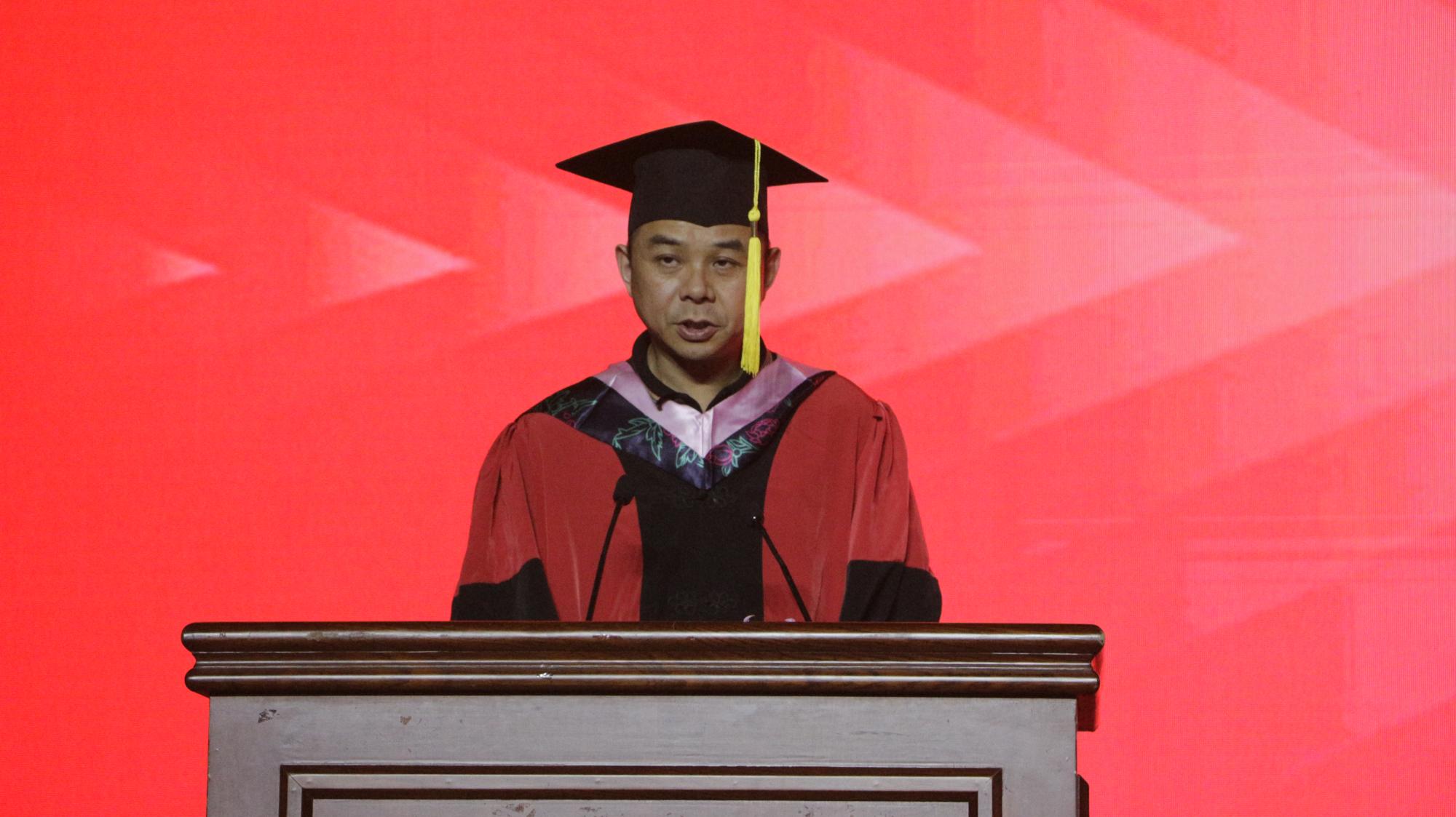“明栋基金”发起人,蓝山投资有限公司董事长王晓明校友代表讲话。作为基金主办方,他对近年来获奖学生取得的丰硕成果感到深深的欣慰和由衷的祝福。他寄语学弟学妹们,感恩母校,志存高远,以“敢于担当、善于协作、勇于创新”的姿态踏入各个新领域,展现浙财人的良好风貌。