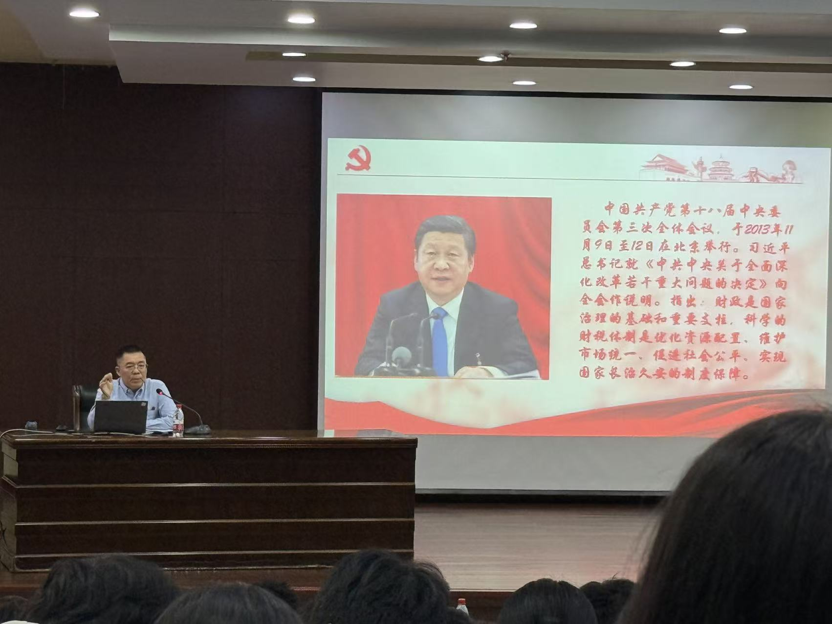 孙国府以《立足财政定位,提升能力水平》为主题,首先结合习近平总书记关于财政工作的重要论述,强调财政工作人员必须坚持党的领导,立足财政在国家治理中的基础和重要支柱作用。随后,他叮嘱同学们要坚守诚信品格,倡导相互包容、周全思考、与人为善,学会换位思考。最后,孙国府提出做好财政工作要具备宏观思维和系统观念,善于统筹资金使用,做到化繁为简。他以小岗村推动中国改革开放的实践为例,鼓励同学们在学习中敏于发现机遇、勇于开拓创新。进一步强化了同学们坚持党的领导的意识,深化了对财政工作的认识,引导大家在今后的学习与生活中自觉践行党的理念,传承红色基因。