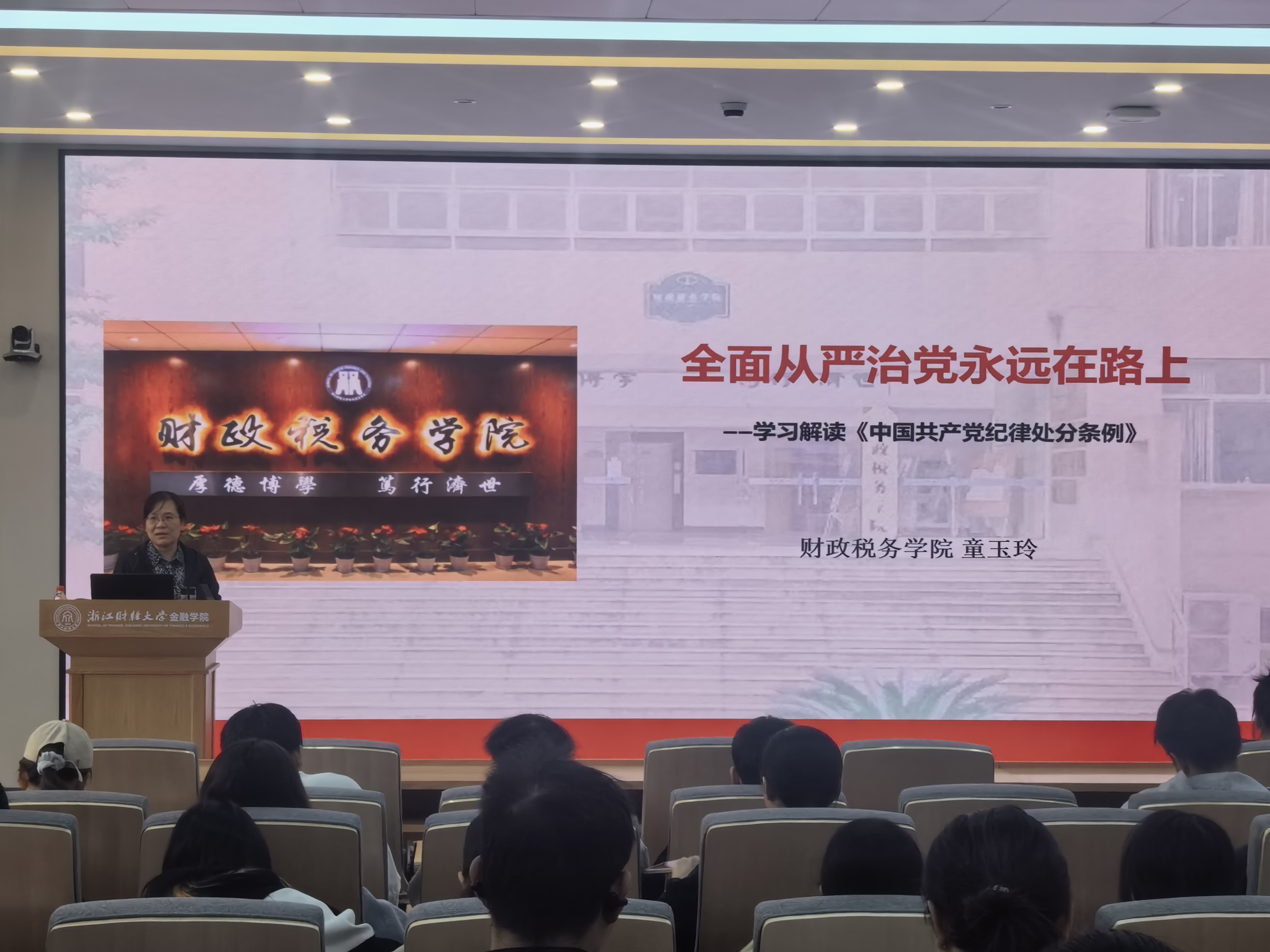 童玉玲以“全面从严治党永远在路上”为主题,围绕《中国共产党纪律处分条例》展开,系统阐释了全面从严治党的深刻内涵与战略意义,强调党的纪律是党的生命线,是全体党员必须遵守的行为准则。童老师重点解读了政治纪律、组织纪律、廉洁纪律等“六大纪律”的核心要求,针对学生党员实际,通过一系列典型案例,详细剖析了在网络言论、宗教信仰、考试诚信、公共行为等方面容易触犯的纪律红线。她警示学员们要时刻绷紧纪律之弦,增强规矩意识,做到心有所畏、言有所戒、行有所止,自觉维护党员形象。