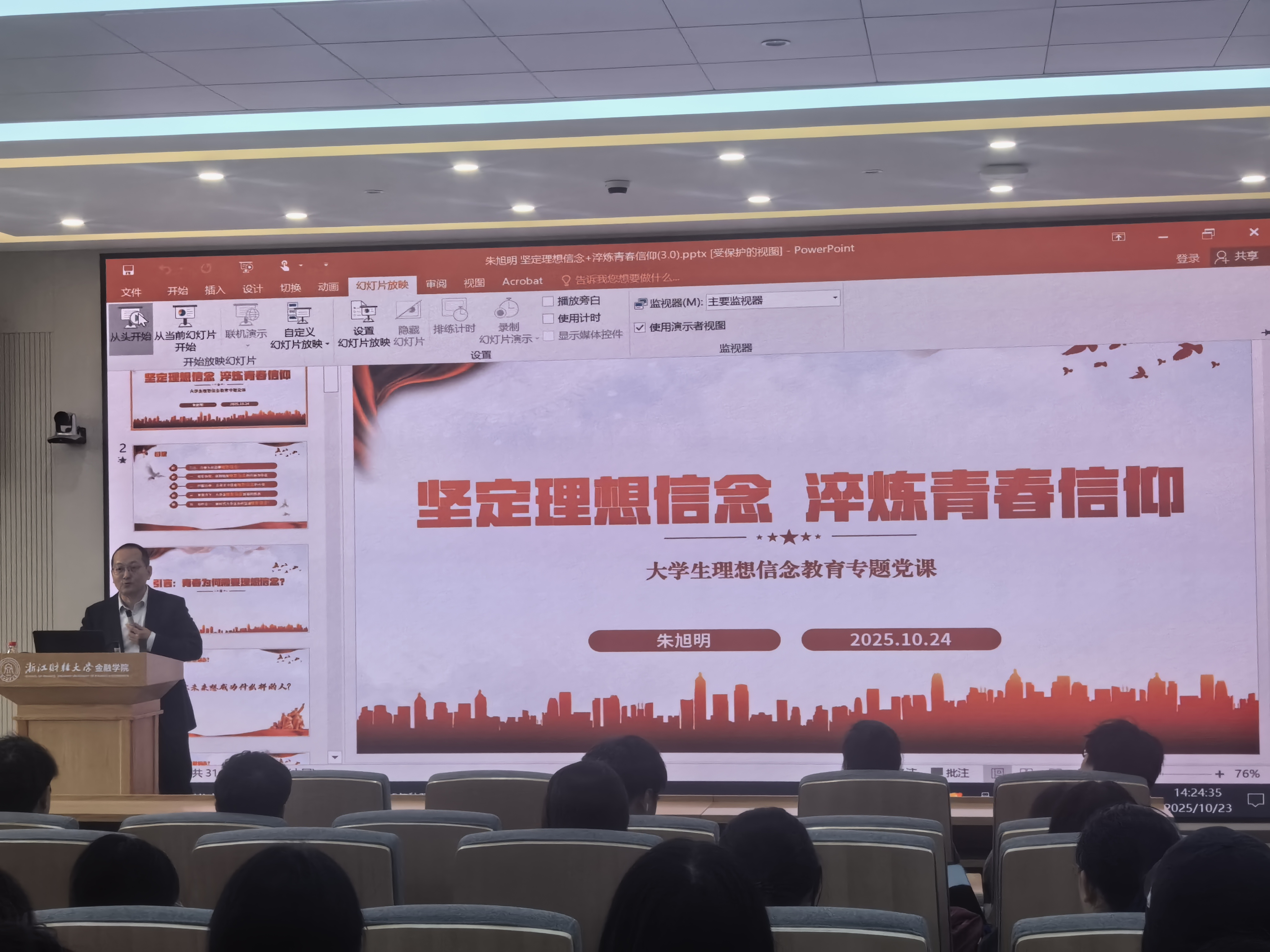 朱旭明以《坚定理想信念,淬炼青春信仰》为题,为全体学员带来一场深刻而生动的理想信念教育课。课程从“青春为何需要理想信念”切入,指出理想信念是人生的“总开关”,引导学员思考个人成长与国家发展的关系。他从“三重”维度对理想信念的内涵价值进行详细解析,带领学员回望党的百年奋斗历程,从中汲取信仰的力量。结合当前大学生在思想层面存在的现实困惑,他鼓励学员要胸怀“国之大者”,勤于学习钻研,坚持知行合一,锤炼品德修为,自觉将个人理想融入中华民族伟大复兴的实践中,真正成为一名有信仰、有担当、有作为的新时代青年。