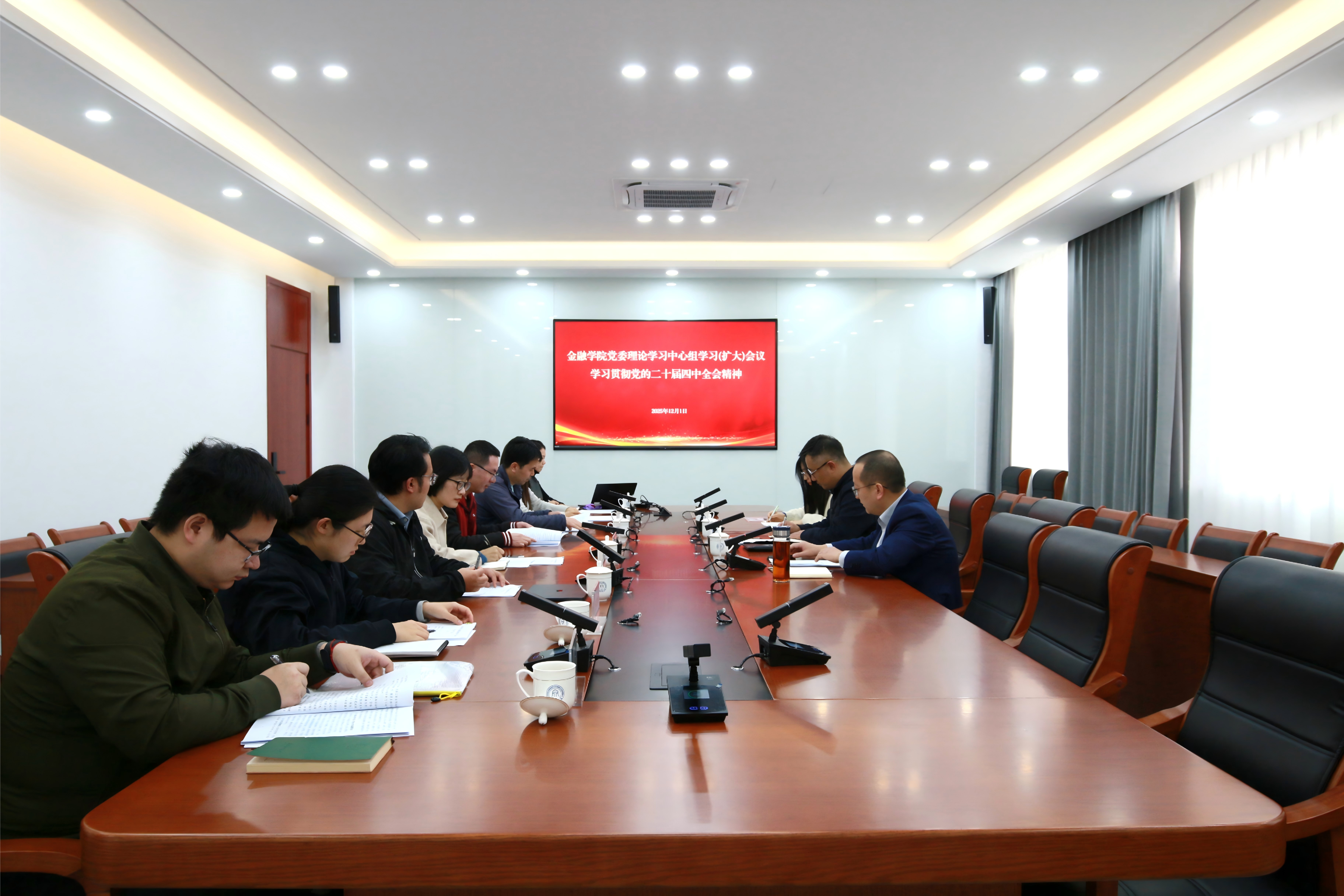 2025年12月1日,金融学院党委召开理论学习中心组学习(扩大)会,专题学习贯彻党的二十届四中全会精神。校党委副书记、统战部部长程爽到会巡听旁听。会议由金融学院党委书记朱旭明主持,学院党委理论学习中心组全体成员、教师代表参加学习。程爽在会上分享...